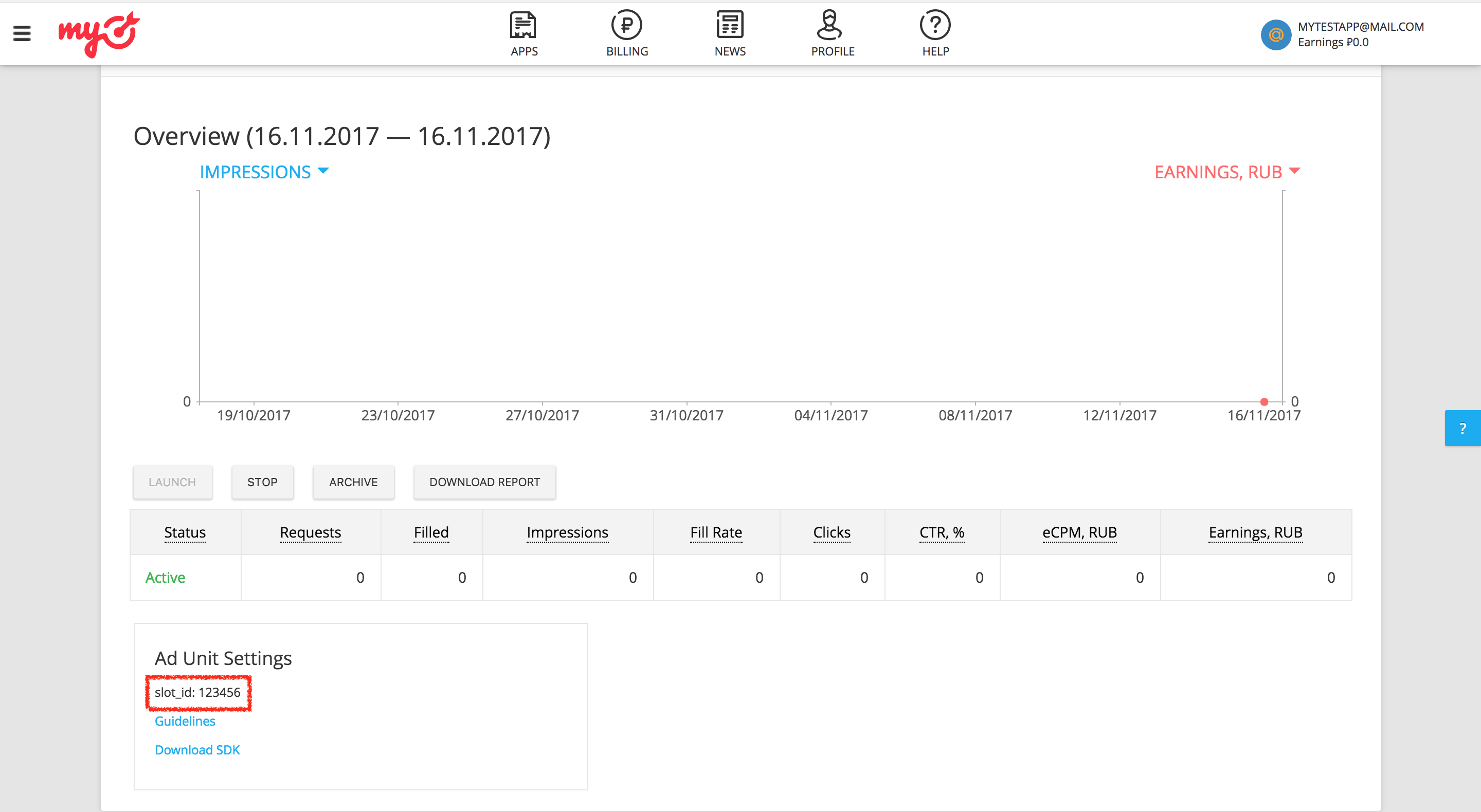 Registrieren Sie Ihr Testgerät für AdMob und aktivieren Sie den Testmodus in der myTarget-Benutzeroberfläche.