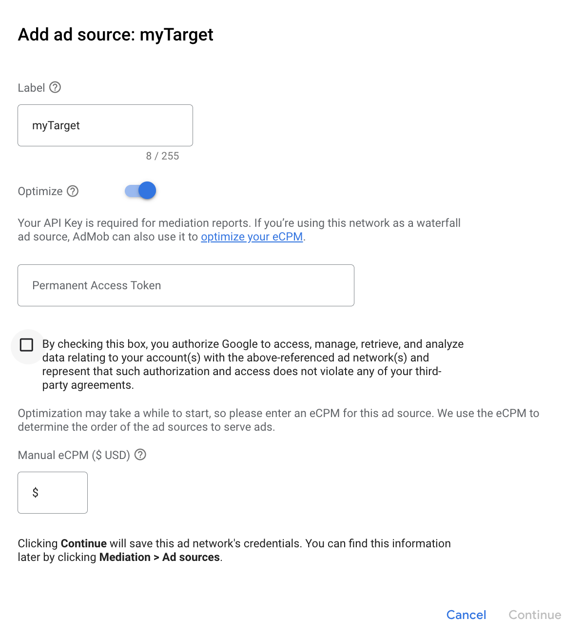 Seleziona myTarget e attiva l'opzione Ottimizza. Inserisci il token di accesso permanente ottenuto nella sezione precedente per configurare l'ottimizzazione dell'origine annuncio per myTarget. Poi inserisci un valore eCPM per myTarget e fai clic su Continua.