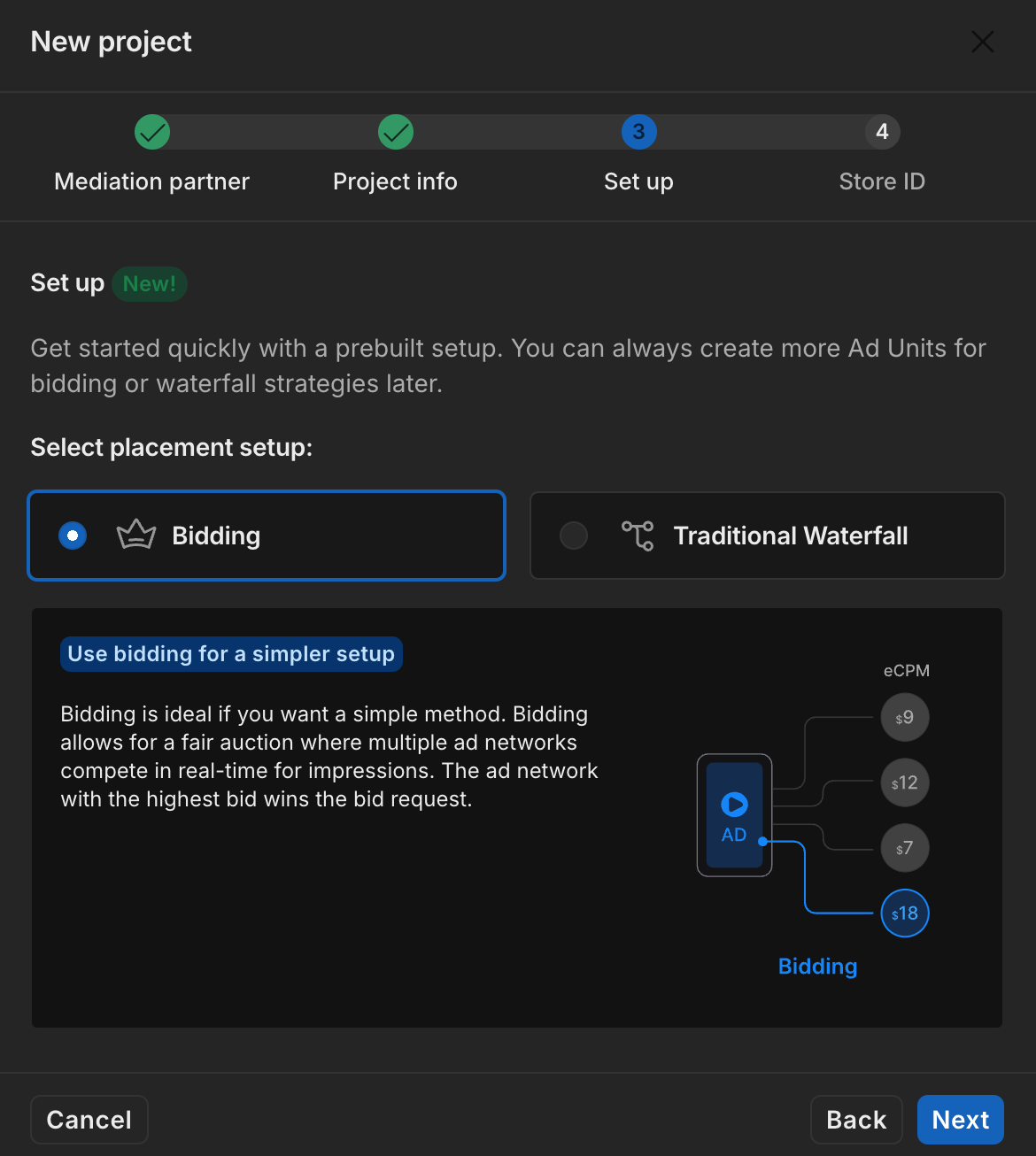 No modal New Project, selecione I will use Mediation e Google Admob para Mediation Partner e clique em Next.