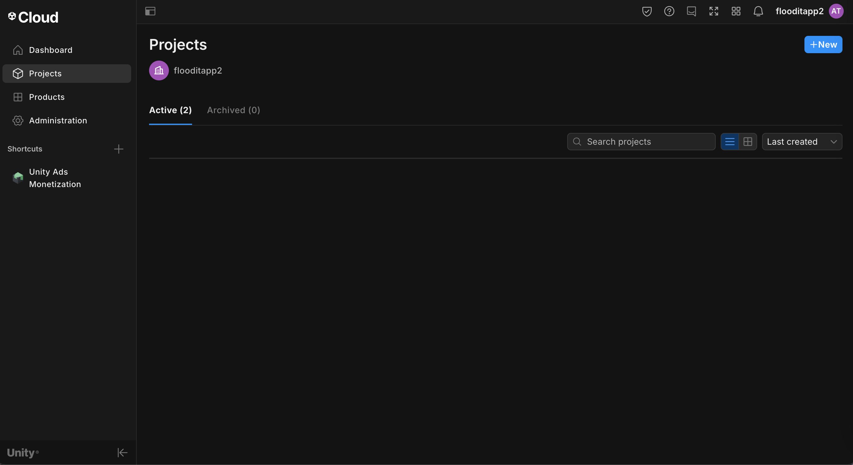 在 Unity Ads 信息中心内,前往项目,然后点击新建。