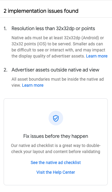 네이티브 광고 검사기는 앱을 출시하기 전에 정책 위반을 찾아내는 데 유용한 새로운 기능으로, 앱에서 정책을 위반한 부분을 자동으로 식별하여 앱의 UI를 통해 이를 알려 줍니다.