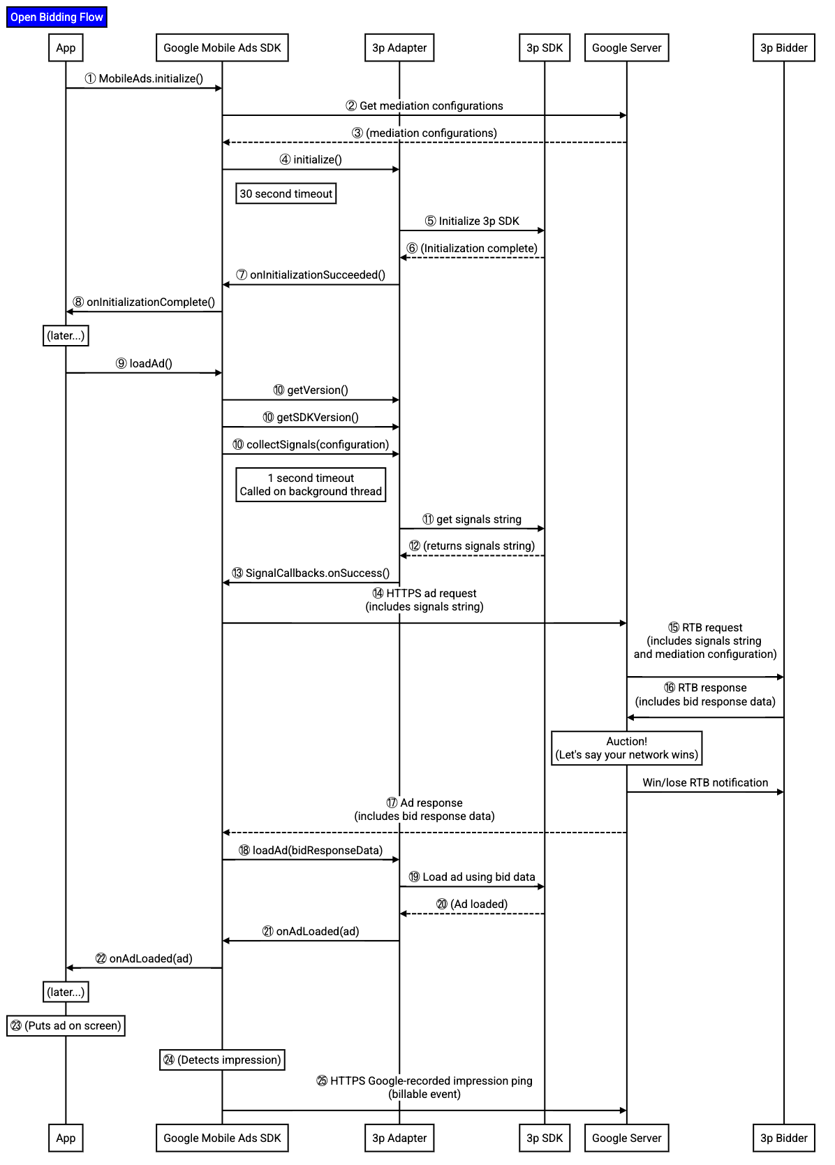 Si tu ofertante devuelve la oferta ganadora, el Google Mobile Ads SDK llama a tu adaptador para cargar el anuncio ganador y te pasa los datos que devolvió tu ofertante y que tu SDK necesita para cargar ese anuncio.