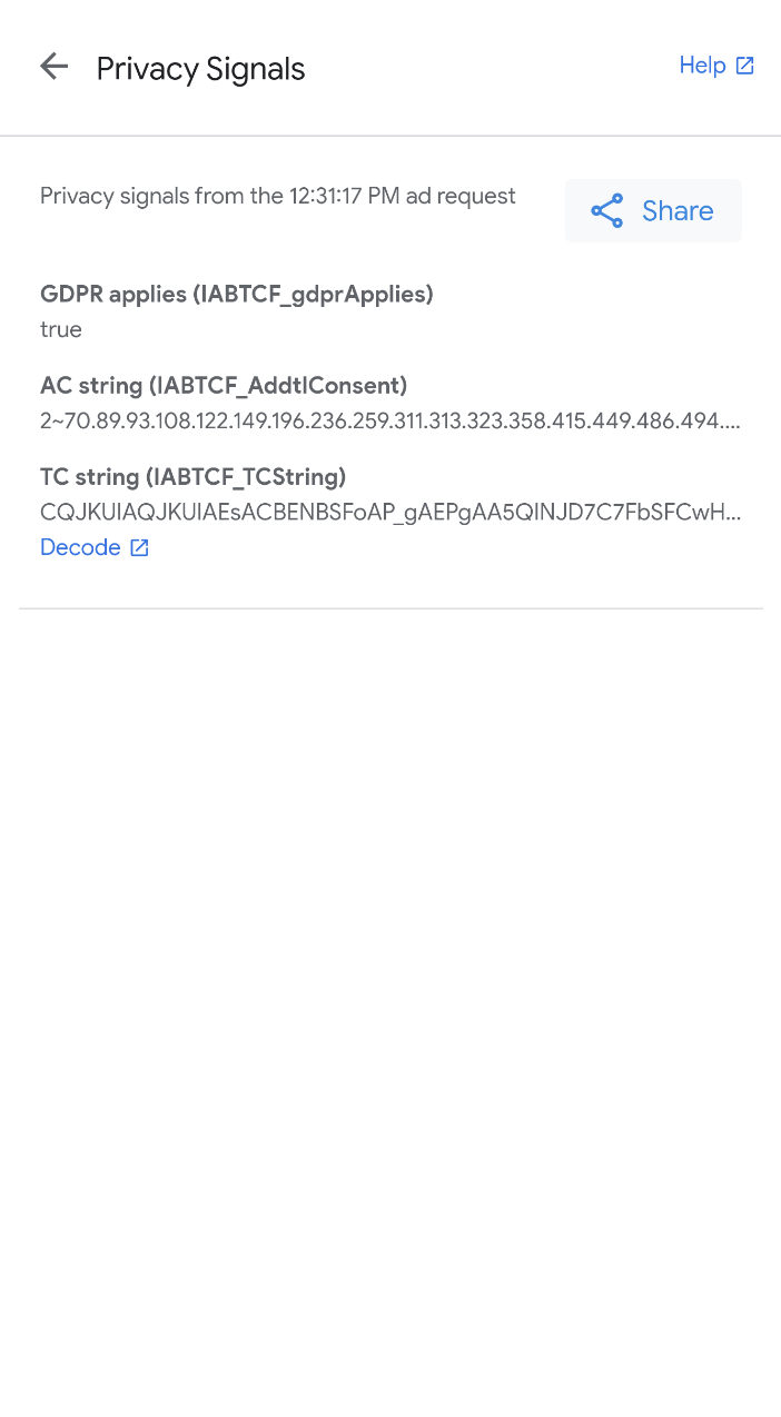 Per saperne di più sulla stringa AC, consulta la specifica tecnica del Consenso aggiuntivo di Google. Per visualizzare i dettagli del consenso nella stringa TC, ad esempio l'ID CMP e l'elenco dei fornitori con consenso di IAB, fai clic su Decodifica. Si apre IAB GPP Encoder / Decoder. Se visualizzi errori, segui Informazioni sui problemi relativi alla privacy.