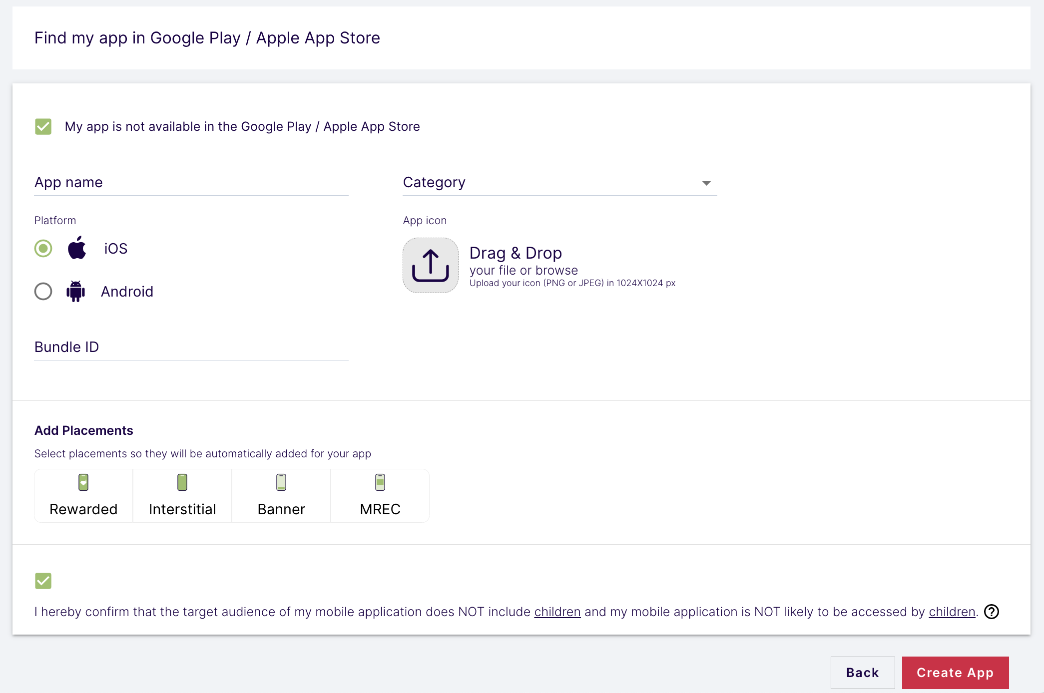 플랫폼과 게재위치를 선택하고 양식의 나머지 부분을 작성한 다음 앱 만들기를 클릭합니다.