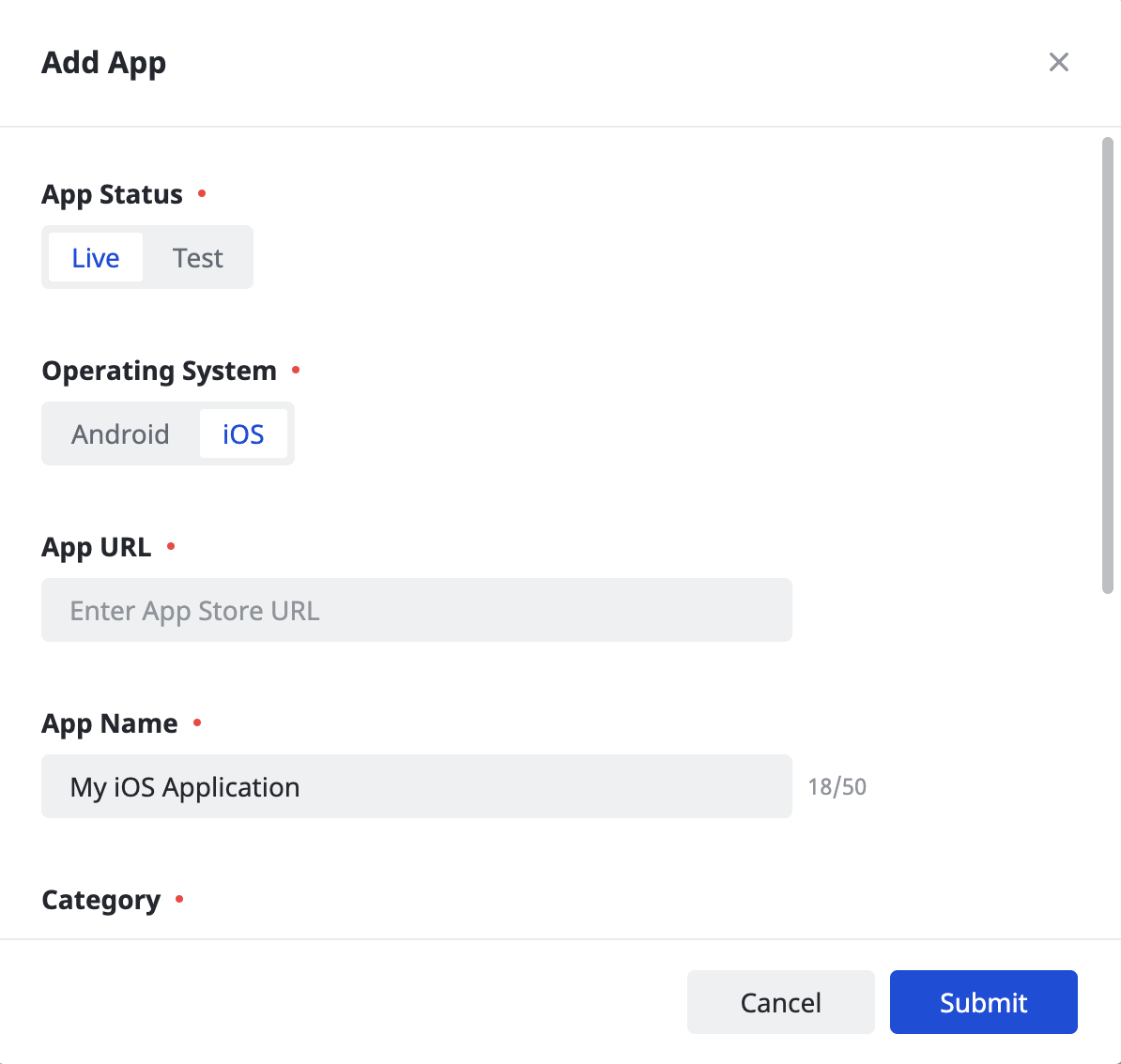 選取要建立應用程式的作業系統,然後填寫表單的其餘項目。然後按一下「提交」
