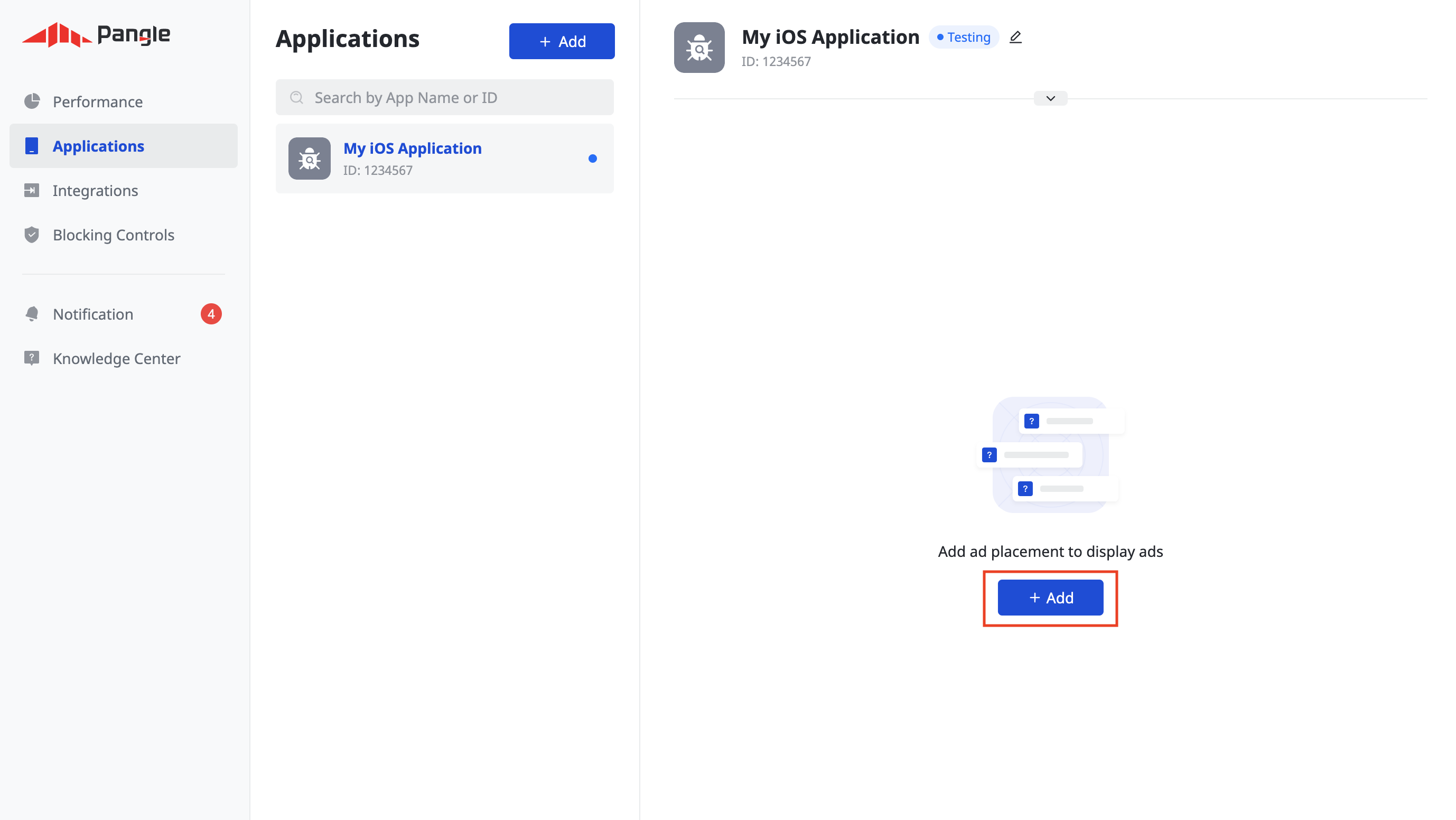 アプリケーションが作成されたら、[Add] ボタンをクリックして広告プレースメントを作成します。