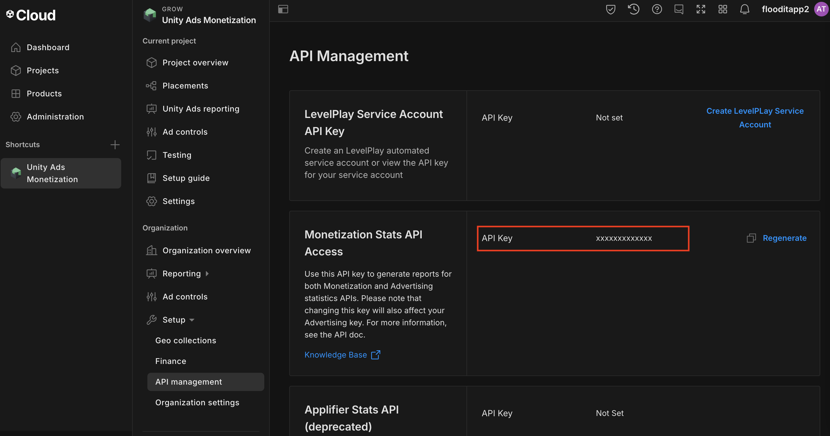 Перейдите в раздел «Монетизация Unity Ads» > «Управление API» и запишите ключ API в поле «Доступ к API статистики монетизации» .