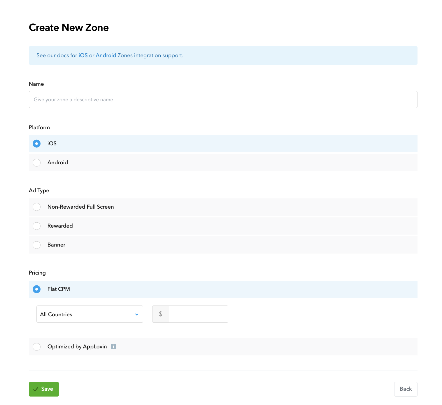[料金設定] で、[固定 CPM] または [AppLovin による最適化] のいずれかを選択して、ゾーンの料金設定を構成します。[固定 CPM] オプションでは、CPM を国ごとに設定できます。次に、[Save] をクリックします。