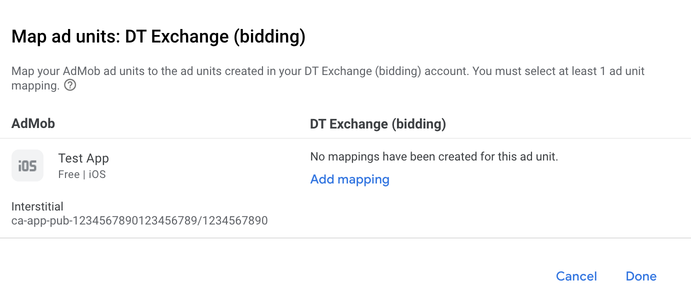 В этом руководстве показано, как использовать Google Mobile Ads SDK для загрузки и отображения рекламы из DT Exchange с помощью AdMob Mediation , включая каскадную интеграцию. В нем рассказывается о том, как добавить DT Exchange в конфигурацию медиации рекламного блока и как интегрировать DT SDK и адаптер в iOS-приложение.