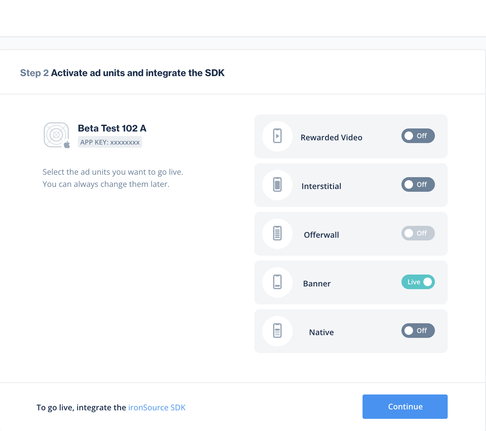 Catat Kunci Aplikasi, lalu pilih format iklan yang didukung aplikasi Anda dan klik Lanjutkan.