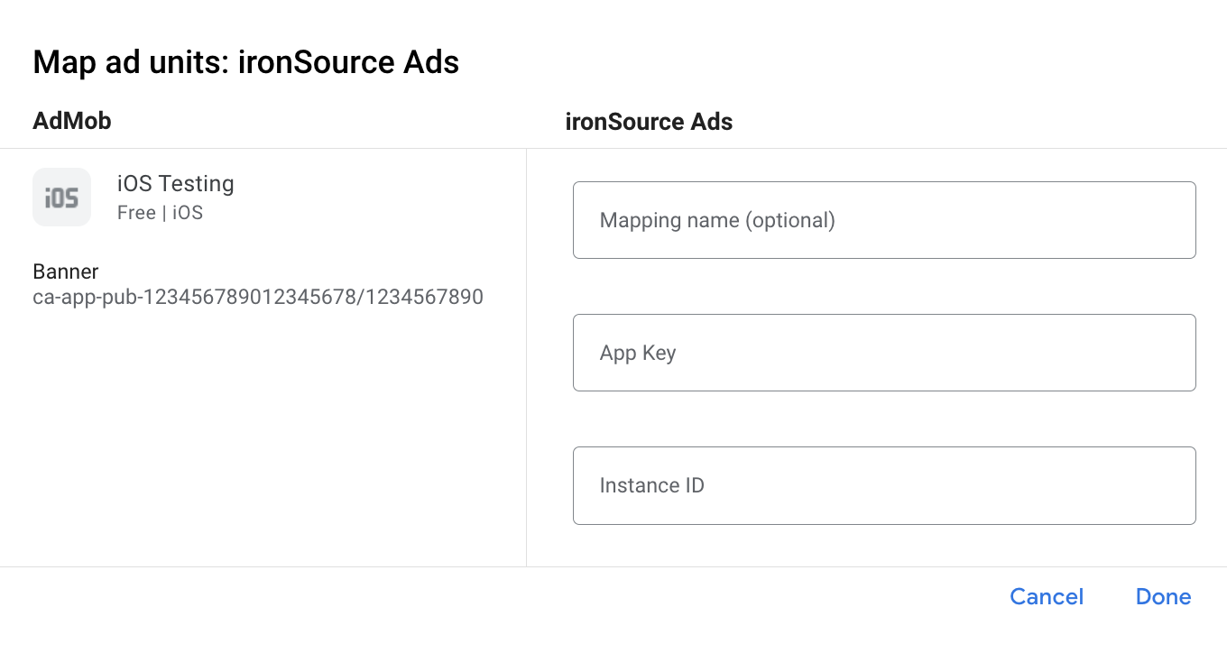 ironSource Ads için zaten bir eşlemeniz varsa bu eşlemeyi seçebilirsiniz. Aksi takdirde, Eşleme ekle'yi tıklayın.