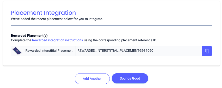 Sélectionnez Avec récompense. Renseignez le champ Placement Name (Nom d'emplacement), activez Skippable (Désactivable) et remplissez le reste du formulaire. [Enchères uniquement] Sous Monétisation, définissez le commutateur Enchères dans l'application sur Activé. Cliquez sur le bouton Continuer en bas de la page pour créer l'emplacement.