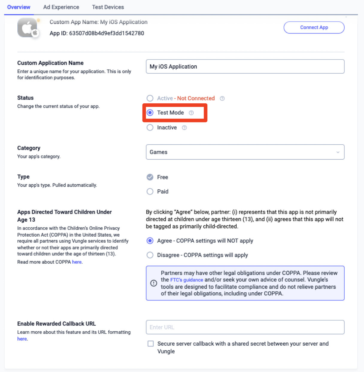 Chọn ứng dụng mà bạn muốn bật quảng cáo thử nghiệm trong phần Placement Reference ID (Mã tham chiếu vị trí) của ứng dụng. Bạn có thể bật quảng cáo thử nghiệm bằng cách chọn Chế độ thử nghiệm thành Chỉ hiển thị quảng cáo thử nghiệm trong phần Trạng thái.