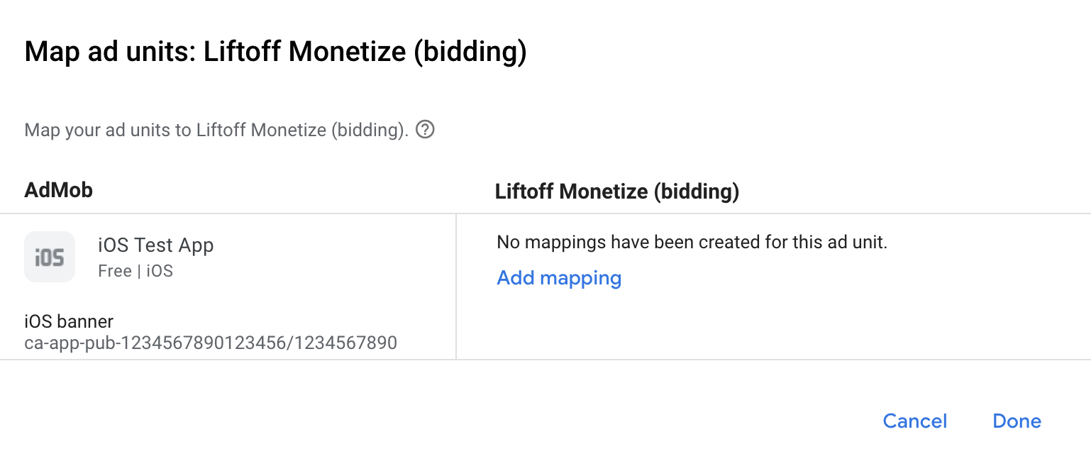 Liftoff Monetize のマッピングがすでに存在する場合は、それを選択できます。それ以外の場合は、[マッピングを追加] をクリックします。