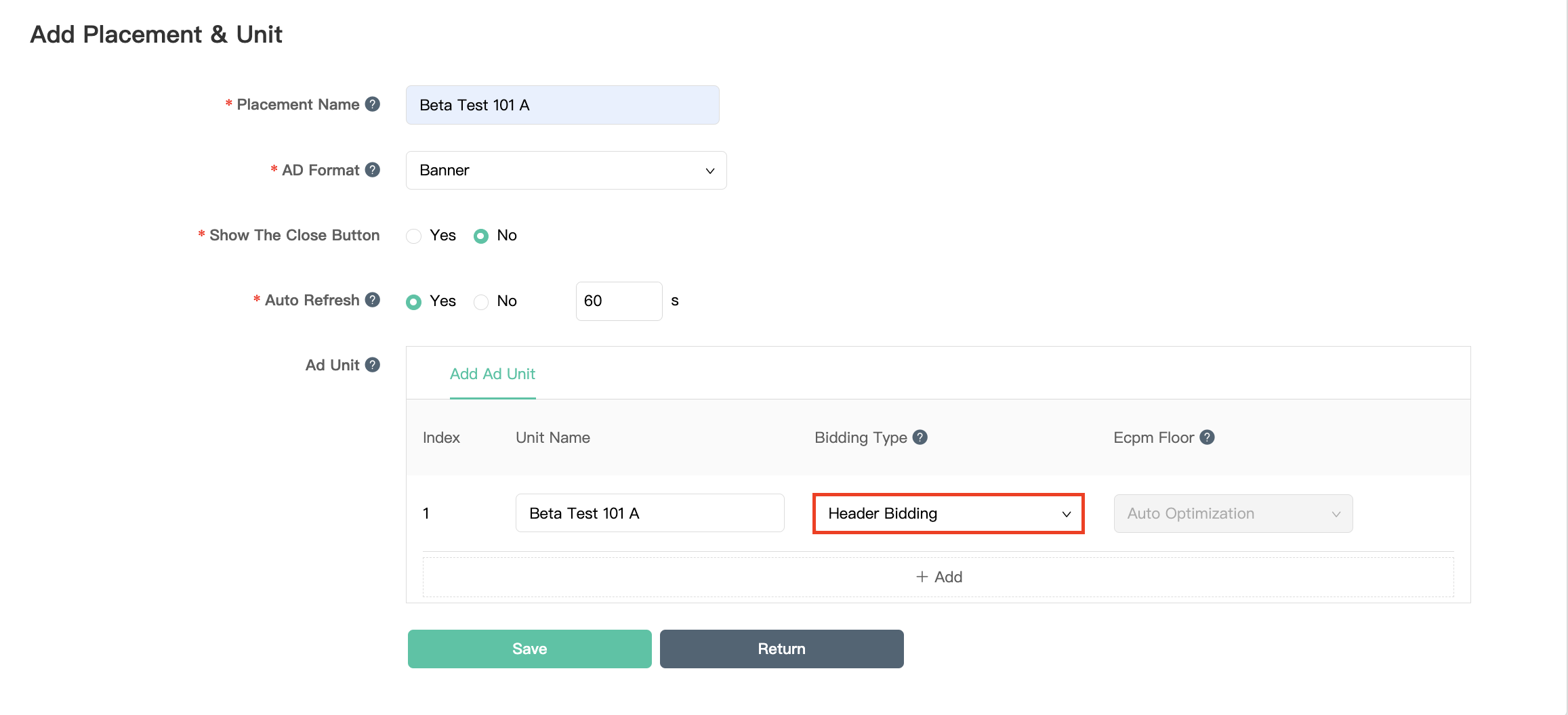Select Header Bidding as the Bidding Type. Fill out the rest of the form and click Save.