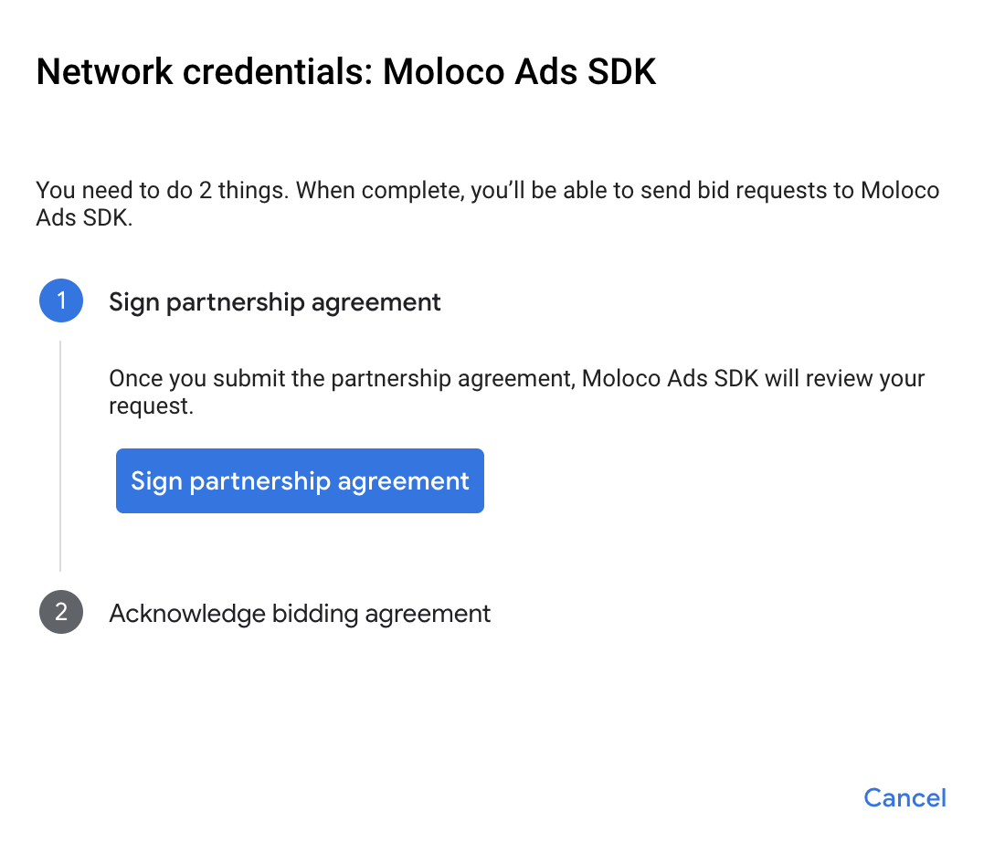 点击如何签署合作伙伴协议,然后与 Moloco Ads SDK 建立出价合作伙伴关系