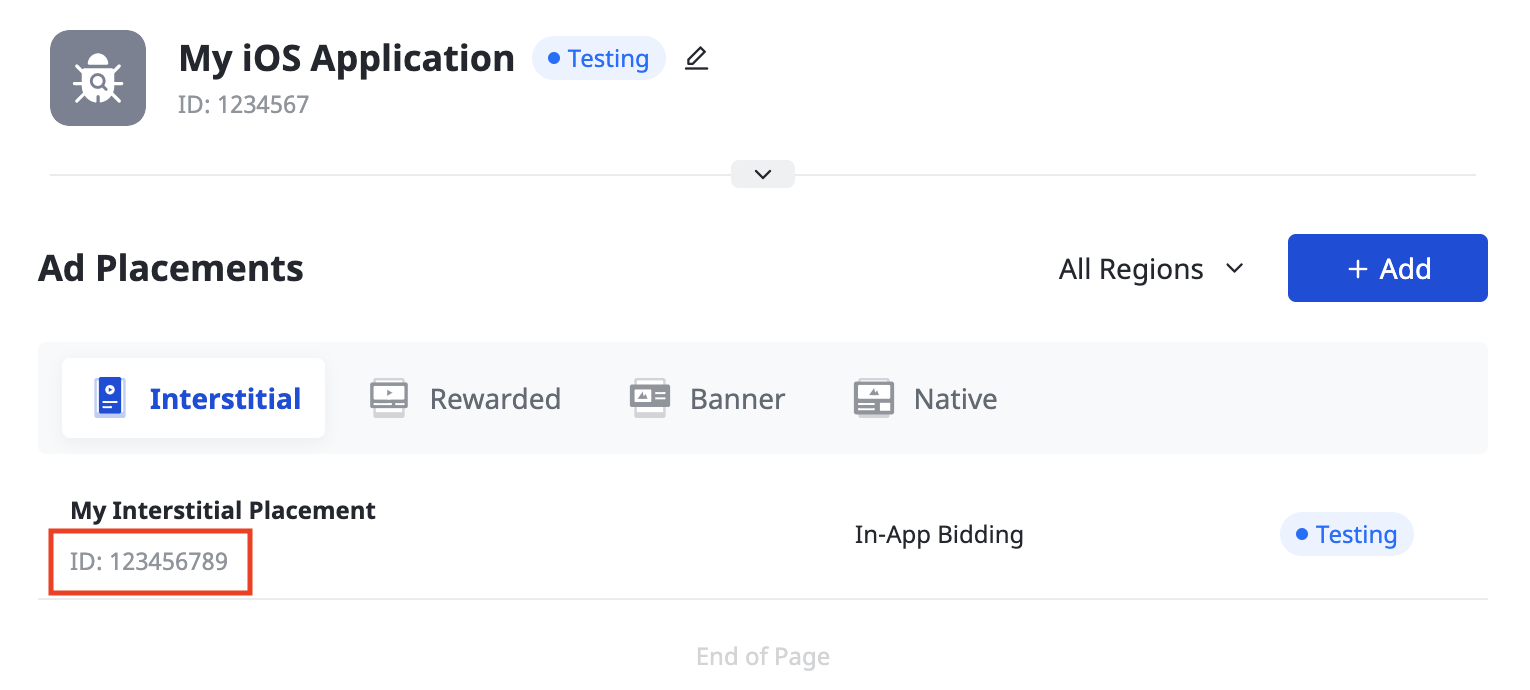 Una volta creata l'applicazione, fai clic sul pulsante Aggiungi per creare il posizionamento dell'annuncio.