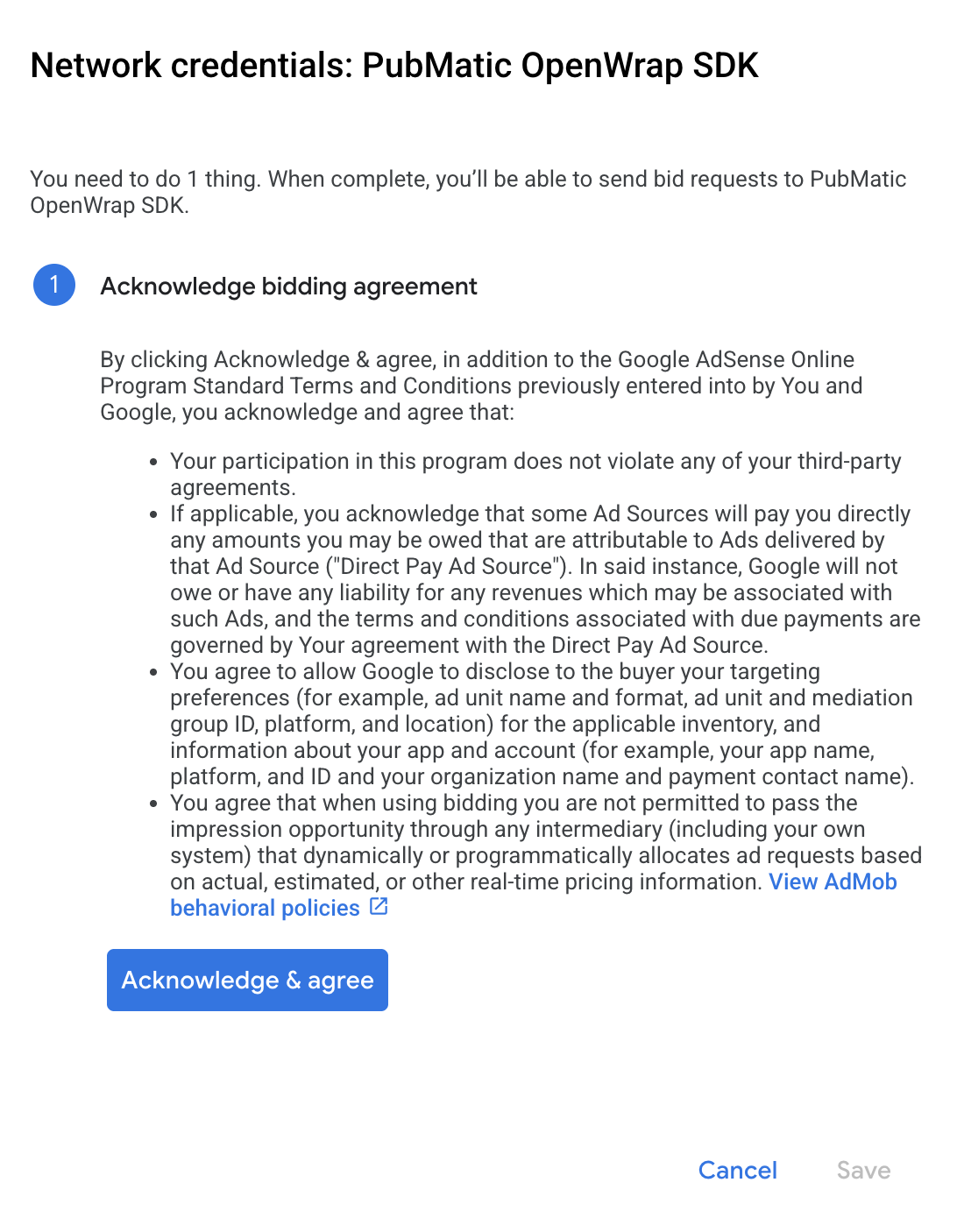 আপনার বিজ্ঞাপন ইউনিটের মধ্যস্থতা কনফিগারেশনে PubMatic OpenWrap SDK যোগ করতে হবে।