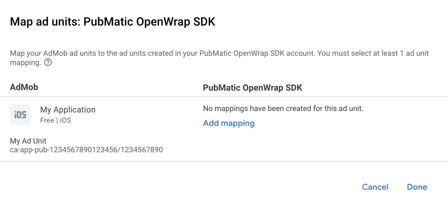 If you already have a mapping for PubMatic OpenWrap SDK, you can select it. Otherwise, click Add mapping.