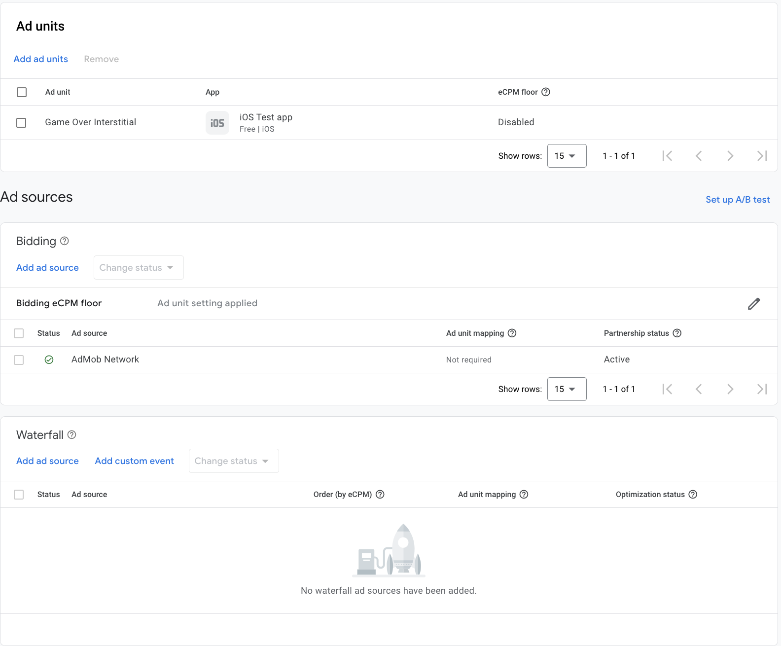 광고 소스 섹션의 폭포식 구조 카드에서 광고 소스 추가를 선택합니다.