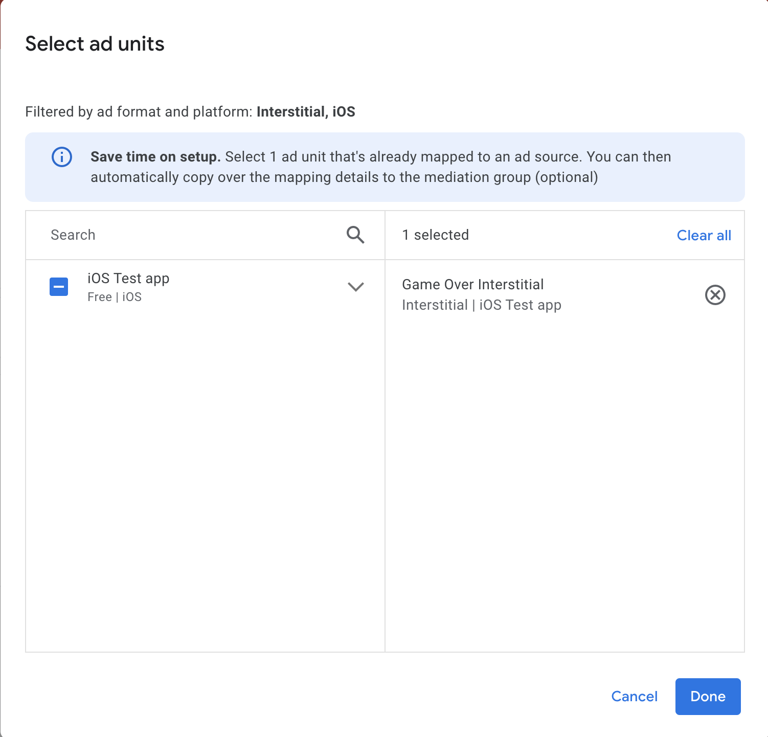 Powiąż tę grupę zapośredniczenia z co najmniej jedną z dotychczasowych jednostek reklamowych AdMob. Następnie kliknij Gotowe.