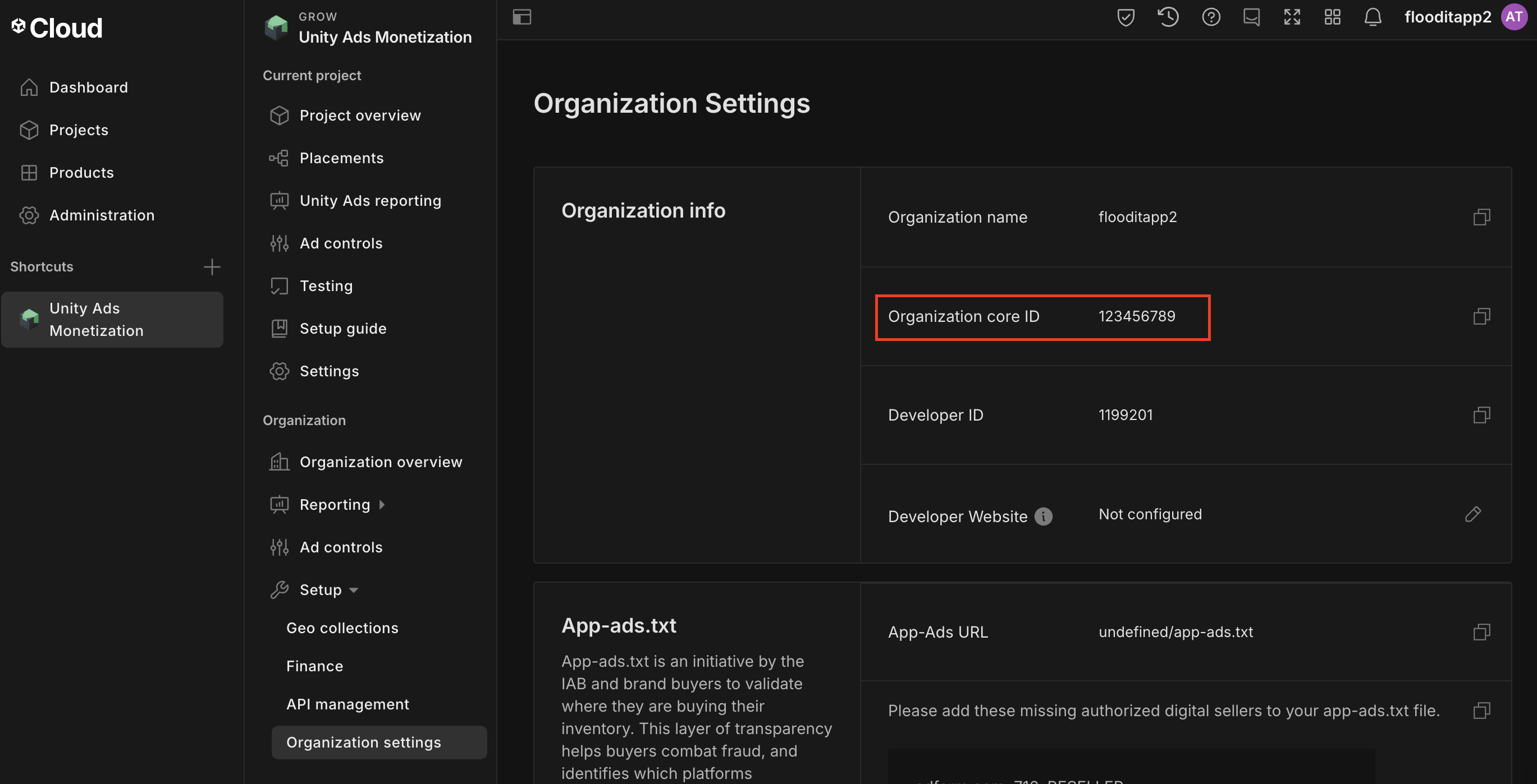 Luego, navega a Unity Ads Monetization > Organization Settings y anota el Organization core ID.
