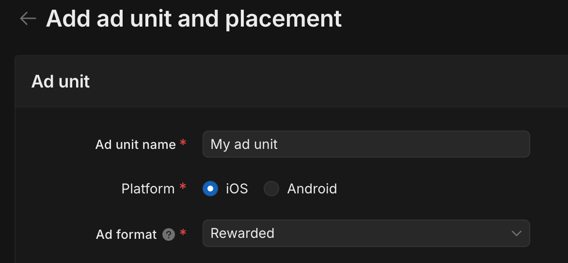 Ingresa un Nombre de la unidad de anuncios y, luego, selecciona tu Plataforma y tu Formato del anuncio.