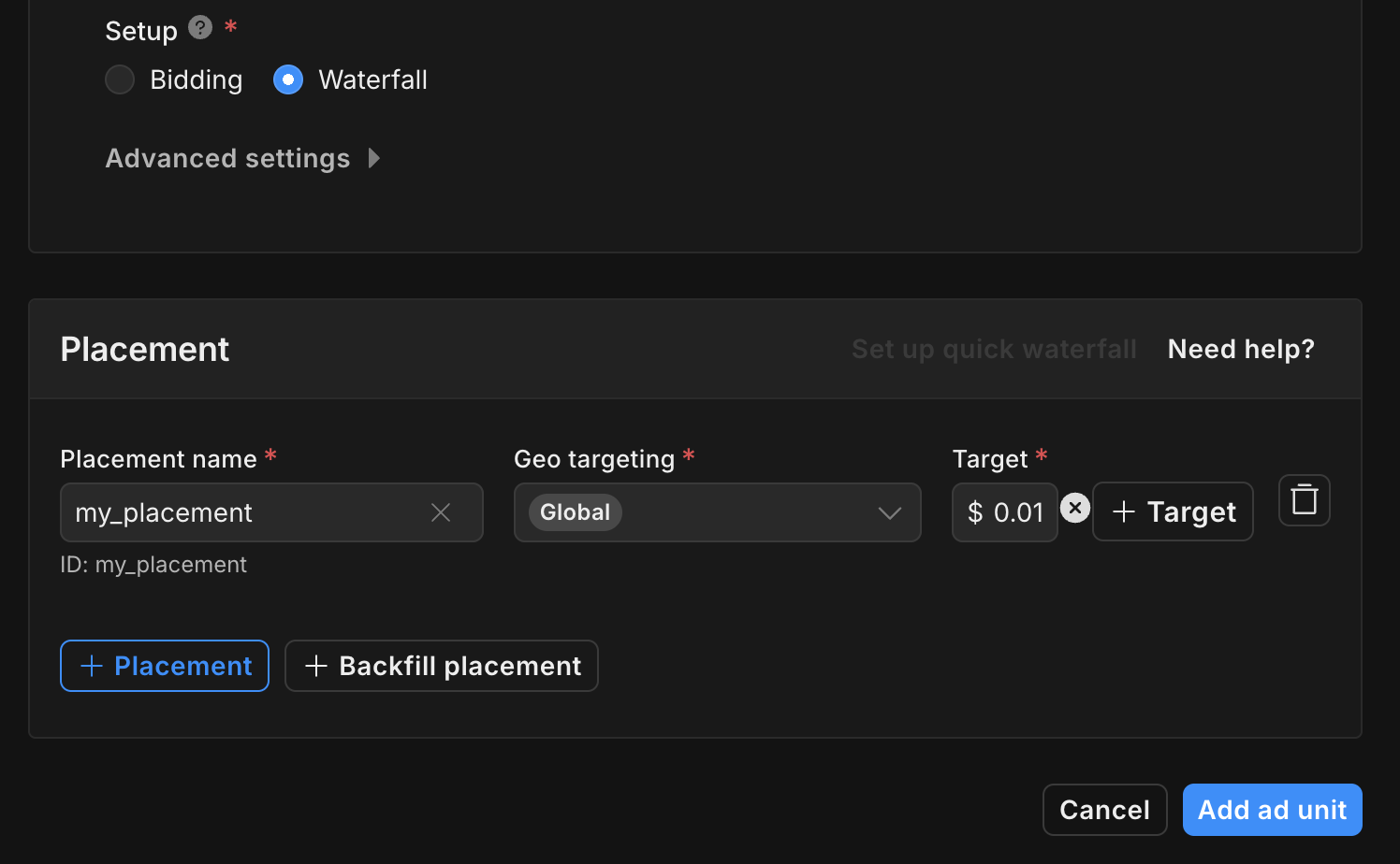 Étape 2 : Configurer la demande Unity Ads dans l'UI AdMob