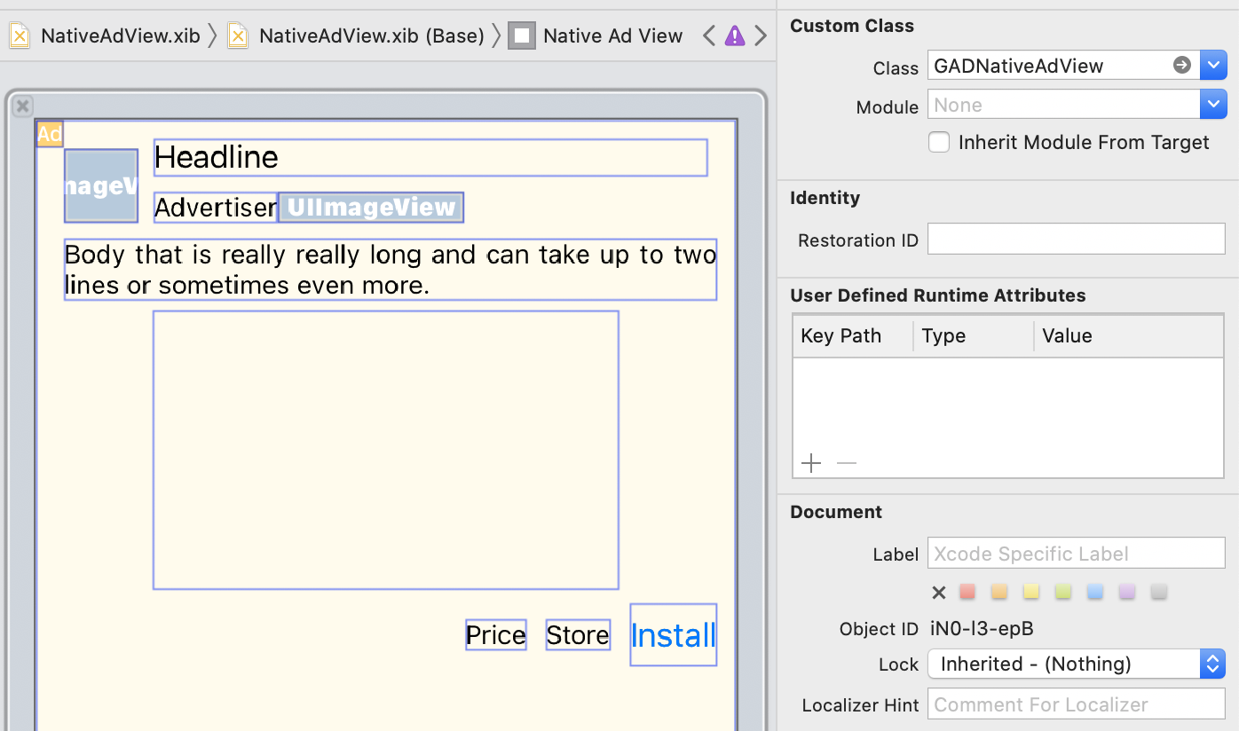 이 섹션에는 xib 파일에서 동적으로 로드된 뷰를 이용해 네이티브 광고를 표시하는 방법이 나와 있습니다. 이 방법은 여러 형식을 요청하도록 구성된 GADAdLoaders를 사용할 때 매우 유용합니다.