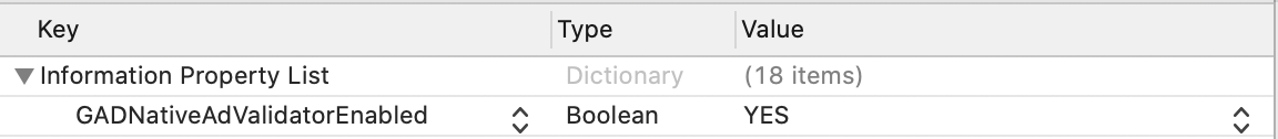 Để tắt Trình xác thực quảng cáo gốc, hãy thêm GADNativeAdValidatorEnabled = false