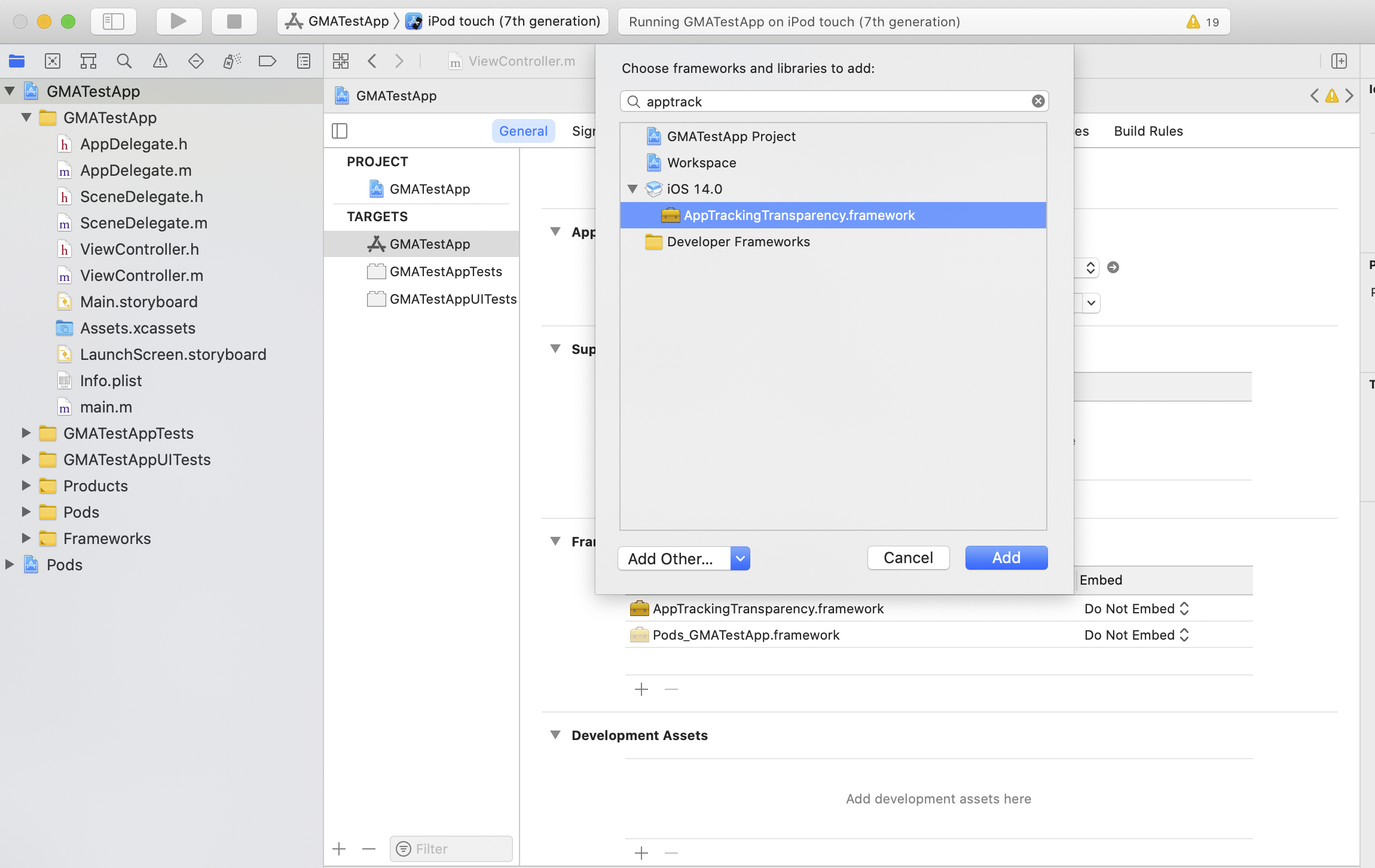 Em seguida, vincule o AppTrackingTransparency framework: