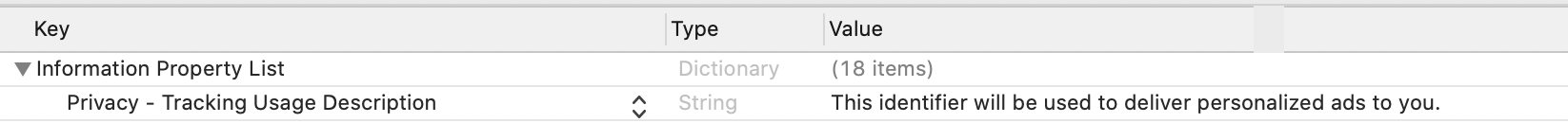 NSUserTrackingUsageDescriptionkey with a custom message to yourInfo.plist. -