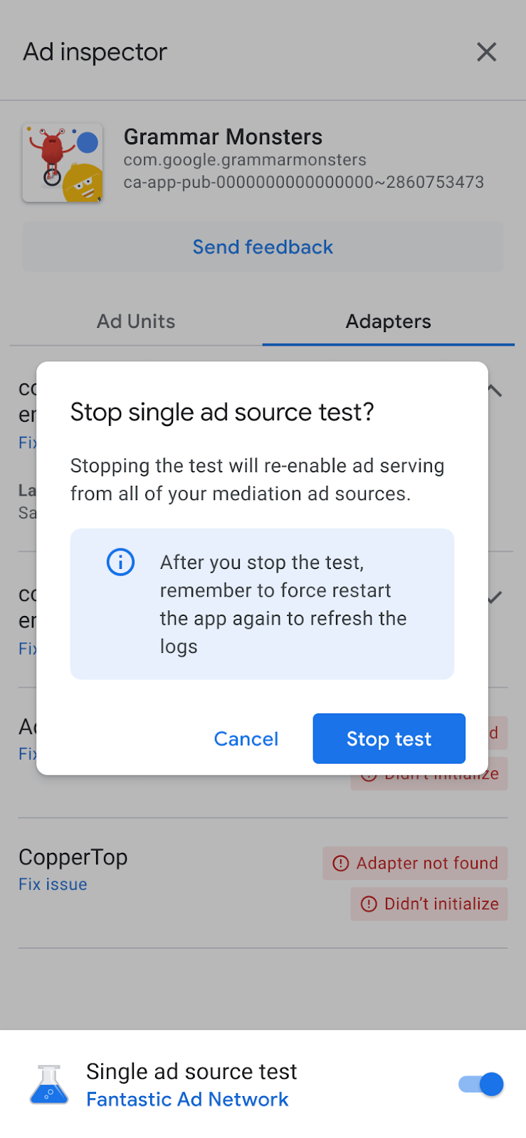 - 在「廣告檢查器」中,點按關閉「單一廣告來源測試」切換鈕。隨即會顯示「停止單一廣告來源測試?」對話方塊。