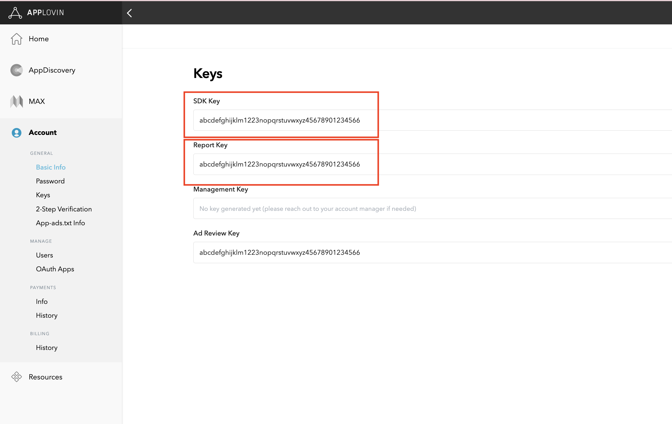 AdMob reklam biriminizi ayarlamak için AppLovin SDK Anahtarınız ve Rapor Anahtarınız gerekir. Bu değerleri bulmak için AppLovin kullanıcı arayüzü > Hesap > Anahtarlar'a giderek her iki değeri de görebilirsiniz.
