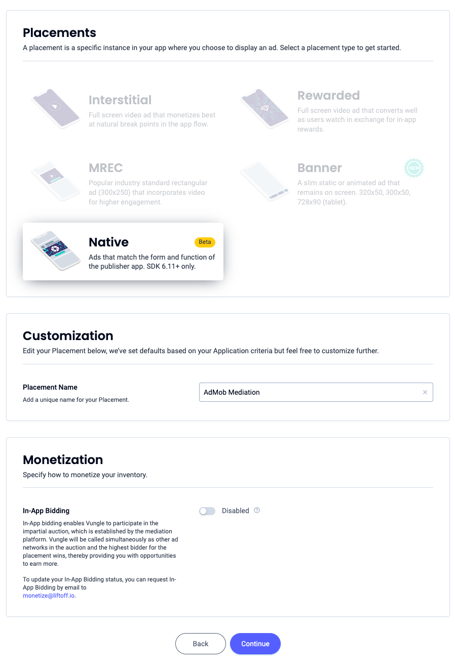 Select Native, enter a Placement Name and fill out the rest of the form. [Bidding only] Under Monetization, toggle the In-App Bidding switch to Enabled. Click the Continue button at the bottom of the page to create the placement.