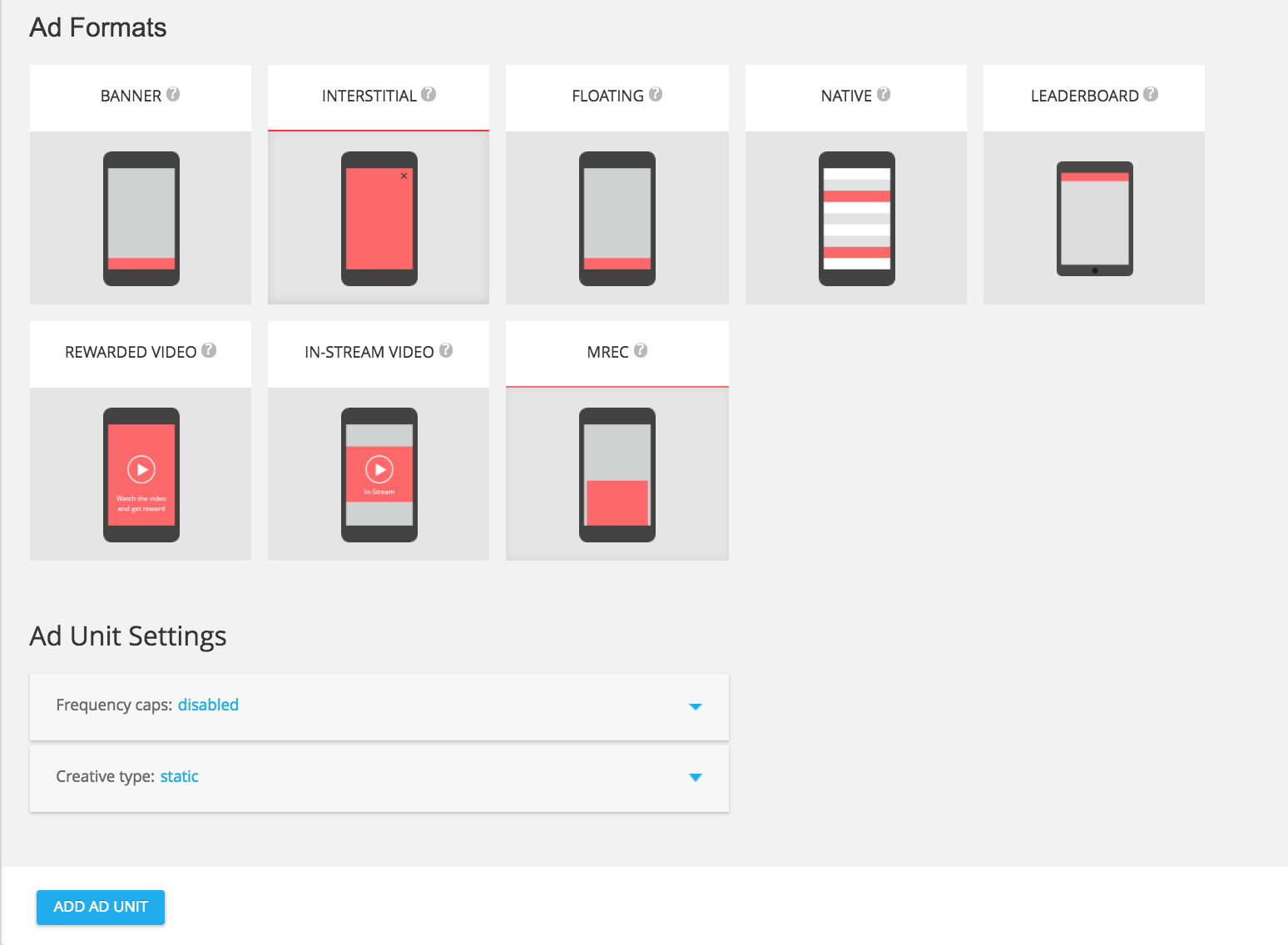 Z dostępnych formatów reklam wybierz REKLAMA WIDEO Z NAGRODĄ, a następnie kliknij przycisk DODAJ JEDNOSTKĘ REKLAMOWĄ.