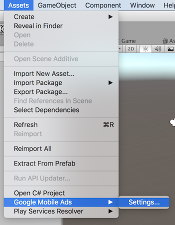 Unity エディタで、メニューから [Assets](アセット)> [Google Mobile Ads] > [Settings](設定)を選択します。