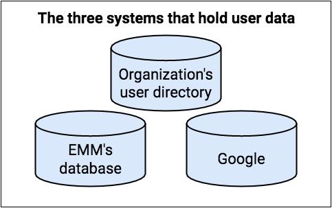 Android 엔터프라이즈 환경에서는 세 가지 시스템이 사용자 계정 정보를 보유합니다.