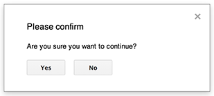 如下例所示,Google 文档、表单、幻灯片和表格都使用 Ui.alert() 方法,该方法有三种变体。如需替换默认的“确定”按钮,请传递 Ui.ButtonSet 枚举中的值作为 buttons 实参。如需评估用户点击了哪个按钮,请将 alert() 的返回值与 Ui.Button 枚举进行比较。