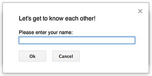 Диалоговое окно «Подсказка» — это предварительно созданное диалоговое окно, которое открывается в редакторе документов, таблиц, презентаций или форм. Оно отображает сообщение, текстовое поле ввода и кнопку «ОК» ; заголовок и дополнительные кнопки являются необязательными. Это похоже на вызов метода window.prompt в клиентском JavaScript в веб-браузере.