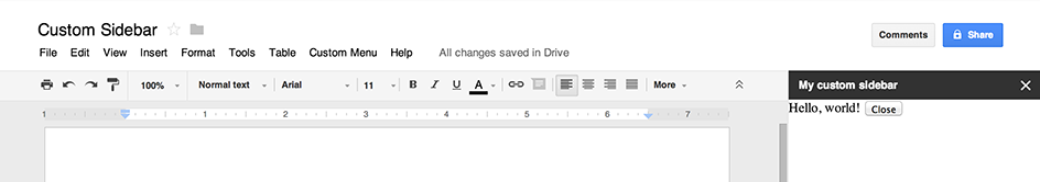 يمكن أن يعرض الشريط الجانبي واجهة مستخدم لخدمة HTML داخل محرّر "مستندات Google" و"نماذج Google" و"العروض التقديمية من Google" و"جداول بيانات Google".