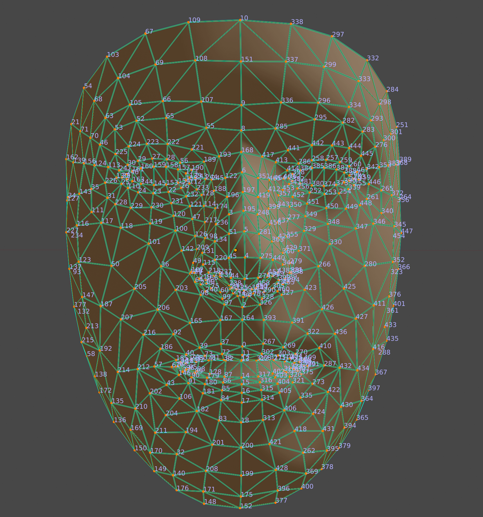 Augmented Faces API menyediakan pose tengah, tiga pose wilayah, dan mesh wajah 3D.