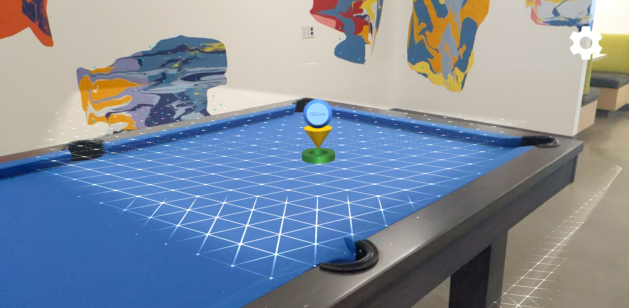 Nella Figura 1, il posizionamento istantaneo è disattivato e la geometria della superficie non è definita. Gli oggetti posizionati sul pavimento a destra del tavolo da biliardo (quattro piccoli puntini blu) sembrano rovesciati e le loro pose non sono definite.