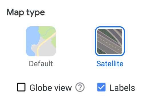 3. غيِّر نوع الخريطة إلى القمر الصناعي وأزِل العلامة من مربّع الاختيار عرض الكرة الأرضية في أسفل يمين الشاشة.