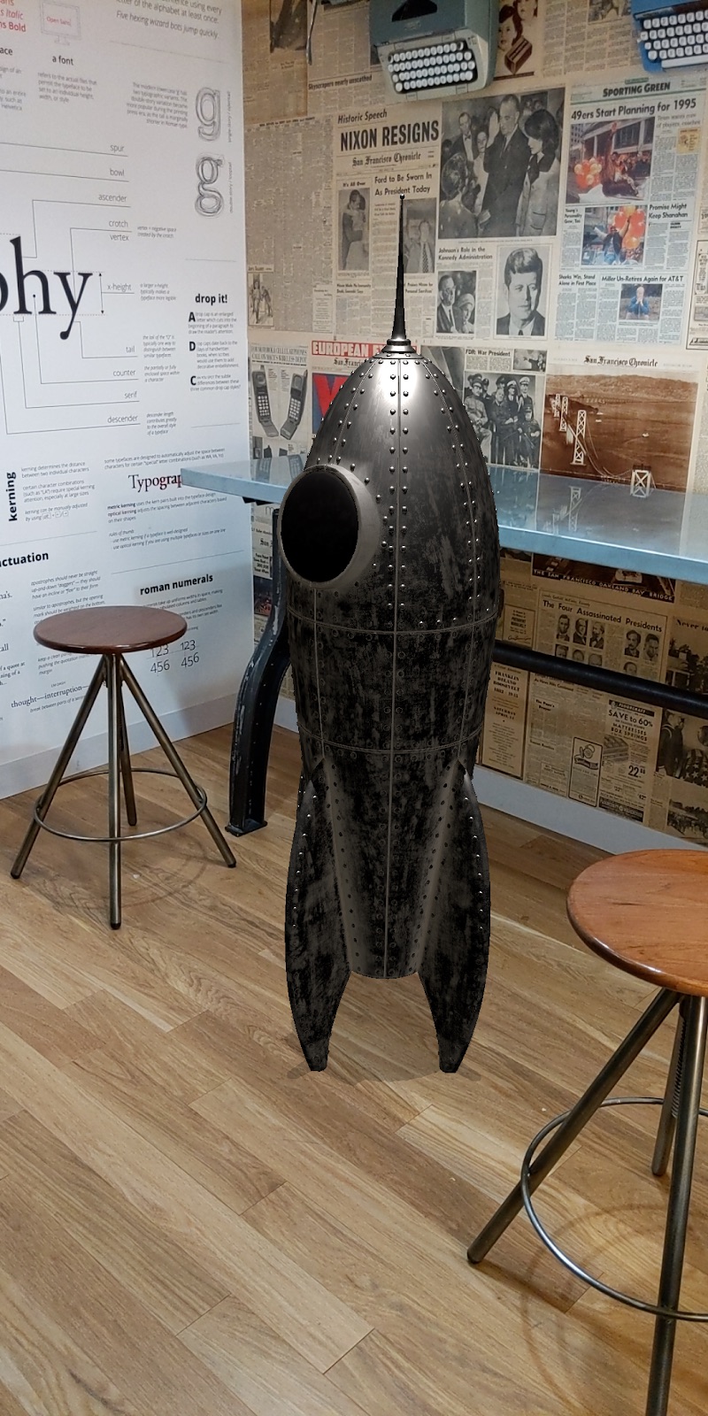 请考虑以下两张同一火箭模型的图片。左侧的火箭是使用主定向光源 API 检测到的光照估算信息渲染的。右侧的火箭是使用主定向光源 API 和环境球面调和 API 检测到的信息渲染的。第二个火箭的视觉清晰度明显更高,并且与场景融为一体。