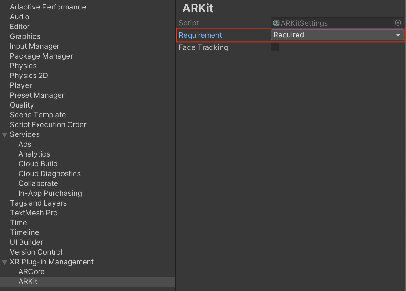 Navega a Edit > Project Settings > XR Plug-in Management > ARKit. Requirement se establece en Required de forma predeterminada.