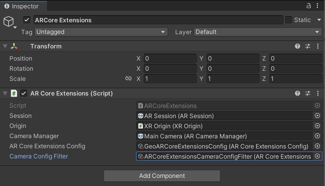 Inspector ペインの ARCore Extensions Config フィールドで、ターゲット