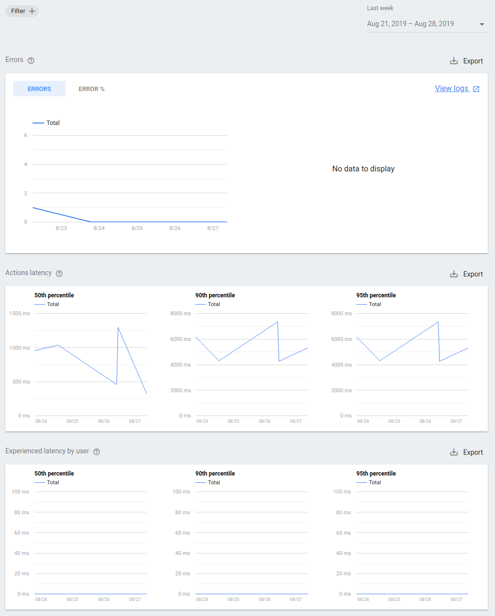 操作延迟时间:您的 Action 端点的延迟时间。如果延迟时间非常高或经常出现峰值,那么您的用户在与您的 Action 互动时可能会遇到延迟。