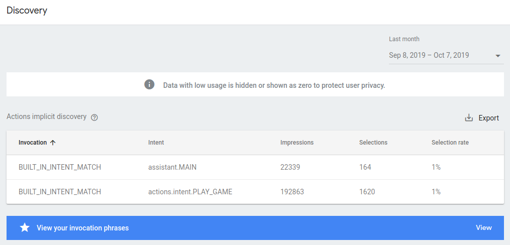Quando gli utenti pronunciano una frase correlata all'Azione, talvolta Google consiglia all'utente di provare l'Azione, anche se l'utente non ha specificato esplicitamente il nome di chiamata dell'Azione. La pagina Discovery mostra una tabella delle frasi che hanno indotto Google a consigliare l'Azione. Le colonne di questa tabella sono le seguenti: