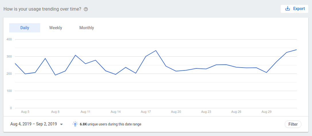 • Assistant की डायरेक्ट्री के पेज व्यू: हर दिन आपकी सेट की गई कार्रवाई के डायरेक्ट्री पेज को देखे जाने की संख्या. व्यू को देश/इलाके, भाषा, और कैटगरी में बांटने के दूसरे उपयोगी विकल्पों के हिसाब से फ़िल्टर किया जा सकता है.
